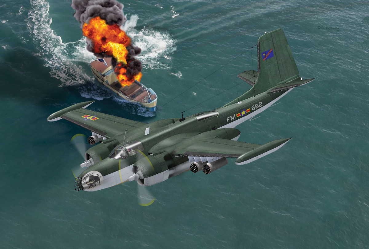 Way ahead of them, the U.S. Air Force had revamped 40 Invaders to a new B-26K “Counter Invader” standard, with fresh wings, upgraded engines, wingtip fuel tanks and more. Over the Congo their bomb bays packed internal fuel for even more range and loiter time, since bombs and napalm were political overkill and eight nose-mounted .50-caliber machine guns and four 19-rocket pods were more than sufficient against the tribesmen. For the Simbas it was a whole new war. A Washington analysis declared, “The relatively heavily armed B-26Ks represent such an escalation of anything ever experienced in this part of Africa that they have caused a profound psychological shock.”