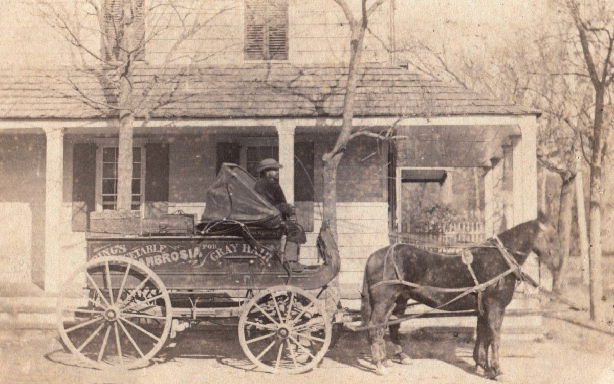 One of the most popular cures for aging hair was developed in 1864 by Philander Ring and Elisha Tubbs. It was marketed as Ring’s Vegetable Ambrosia for Gray Hair. This wagon was used to transport their product throughout the states to sell to men in need of a more youthful appearance.