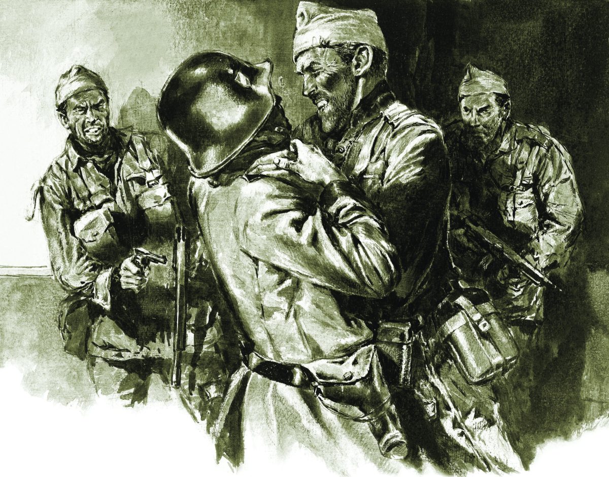 Seven marble steps rose to a heavy wooden double-door. Rather than storm the entrance, Keyes had Campbell simply knock loudly at the door. The captain’s German proved critical once again—he demanded to be let in. A big bear of a German sergeant armed only with a bayonet opened the door, and the Commandos rushed in before he could react. They were standing on a stone-floored foyer with two doors on the left and a stairway and another door on the right. Keyes aimed his Colt automatic at the man, but before he could pull the trigger, his target grabbed the gun, then Keyes himself. As the pair struggled, Campbell and Sergeant Jack Terry jockeyed to get off a shot. Finally, Campbell fired three times with his service revolver. The foe crumpled to the ground. Campbell remembered Keyes saying that his arm had gone numb.
