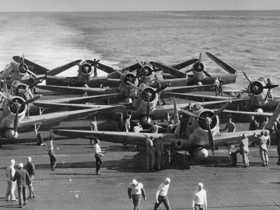 Arrayed in five “V” formations 2,000 feet below, 36 Nakajima B5N2 “Kate” level bombers and 36 Aichi D3A1 “Val” dive bombers roared toward the island. An escort of 36 Mitsubishi A6M2 Zeros flew out of position just below and behind them, expecting to catch the Americans climbing to attack. The Marines’ altitude advantage gave them a free pass at the exposed Japanese bombers.
