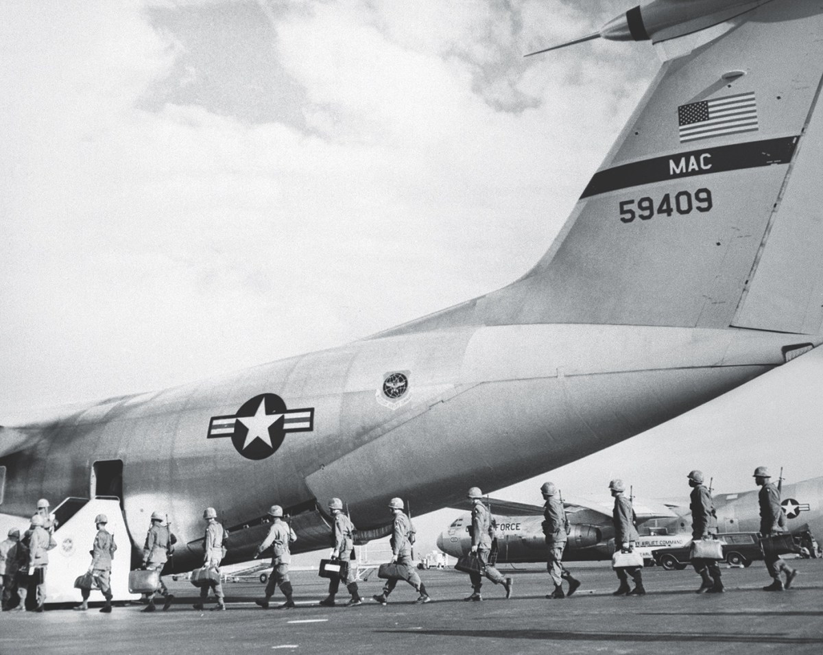 One of the Starlifter’s first wartime missions was “Operation Blue Light,” conducted by the Air Force’s 61st Military Air Wing to transport the 3rd Brigade, 25th Infantry Division, to Vietnam. Army Col. Everette Stoutner, the brigade’s commanding officer, received orders Dec. 10, 1965, to deploy from Schofield Barracks, Hawaii, to Pleiku in South Vietnam’s Central Highlands. His unit took off for Vietnam on Dec. 24. The 3rd Brigade consisted of three infantry battalions, an artillery battalion, combat engineers and various support/administrative units. The operation required 12 C-141s and four Douglas C-133 Cargomasters for what was then the single largest troop airlift in history, involving more than 3,000 men and an estimated 2,000 to 4,000 tons of equipment. The operation was completed in early 1966.