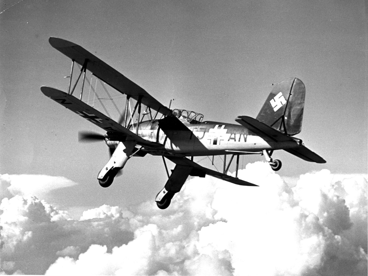 First flown in 1938, the Fi-167 was a large, two-bay, two-seat, single-engine biplane with folding wings and a tail hook. The preproduction Fi-167A-0 had tall, talon-like fixed landing gear; a beak-like cowling surrounding its 1,100-hp Junkers Jumo engine; and a slightly humpback-shaped fuselage that endowed it with a peculiar bird of prey appearance. That form actually followed function, however: The humped configuration was intended to improve visibility, while the tall landing gear was designed to increase the angle of attack, improving lift and drag during takeoff and landing. The main landing gear legs could be jettisoned if the biplane had to ditch in the water, and the lower wings were equipped with bladders to keep it afloat for a limited time.