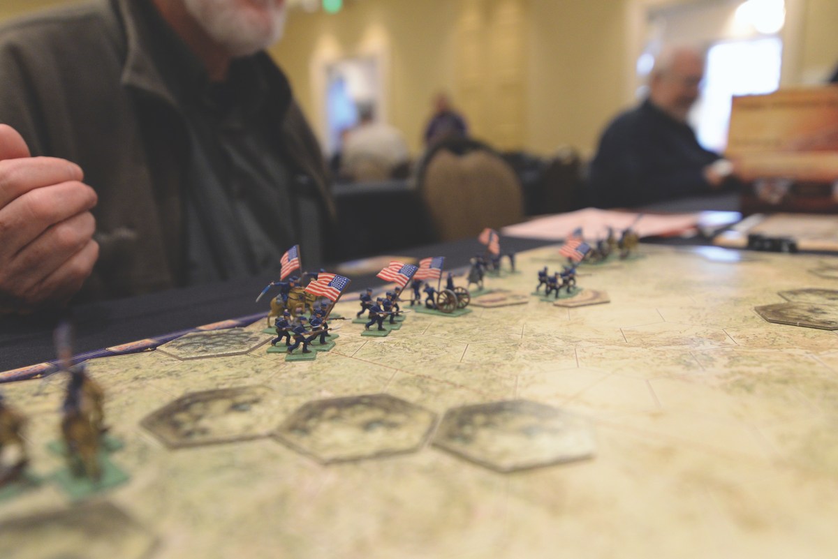 The backdrop for these contests is not a sprawling battlefield, but a DoubleTree Hotel about five miles from the University of Virginia campus, host to the annual Prezcon board gaming convention. Gordon and McBee are among dozens of players who have been playing in a tournament of the Civil War game Battle Cry, a popular tabletop game that hinges on both lucky die rolls and strategic maneuvers. The 2020 convention, held in late February before the pandemic closed down such things, drew hundreds of gamers for a week of tournaments. Hundreds of board games were in play, with several focused on the Civil War.