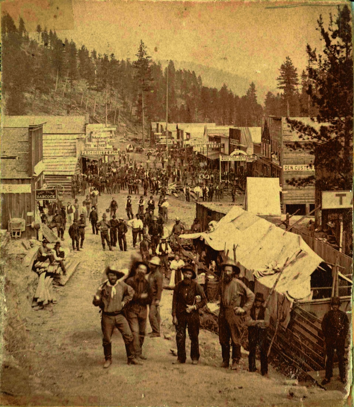 Deadwood grew from the promise of wealth. During the summer of 1874, a band of U.S. cavalrymen led by Lt. Col. George Armstrong Custer discovered traces of gold in the Black Hills. Custer encouraged exploration there, although the Black Hills belonged to the Sioux Reservation and were off-limits to white civilians. Government officials could do little to stop the rapid influx of fortune seekers, and eventually they stopped trying. Between 1874 and 1877, some 20,000 prospectors made the trek to Deadwood Gulch. In 1875 the fledgling settlement — Deadwood City became the commercial district in the gulch — was given its official name, when a tract of surrounding pine forest was destroyed by fire. Deadwood didn’t have an organized government until October 1876.