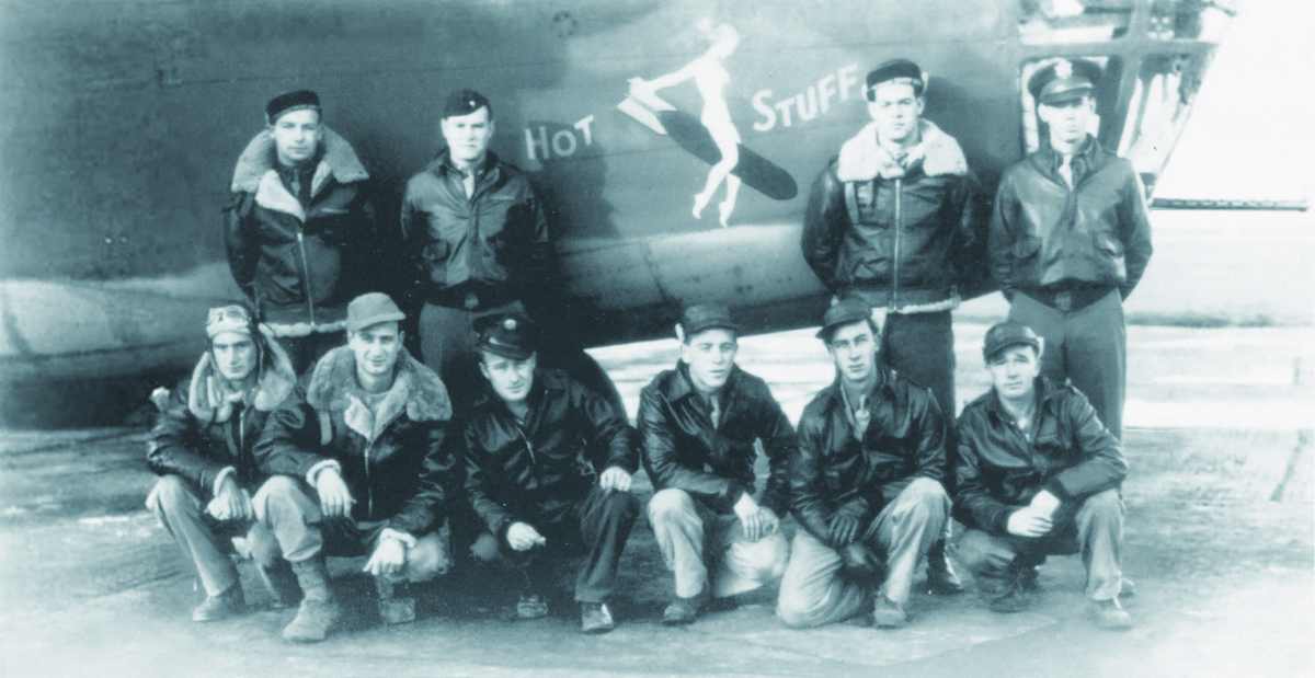 Heavy bombers of the Eighth Air Force—like these B-17s over Berlin in 1945 (above)—took the war to Germany in the face of Luftwaffe fighters and constant flak, making the 31 missions Hot Stuff (below) completed all the more impressive. (U.S. Air Force)