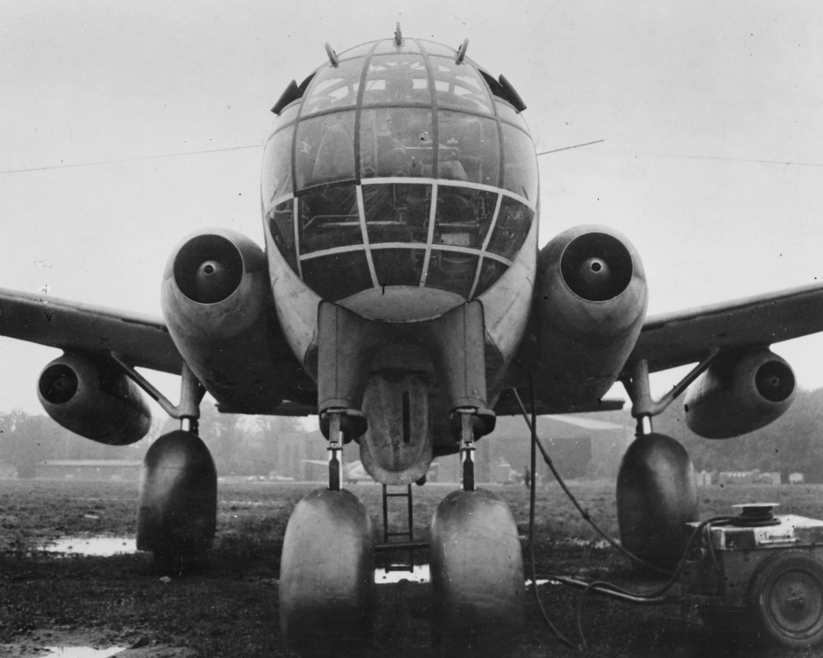 Because the design was so unorthodox, the German air ministry directed Junkers to begin with a full-scale flying test-bed to evaluate flight characteristics while the final design of a production bomber was being worked out. To accelerate construction of the test-bed, the design utilized a number of off-the-shelf airframe components: a fu­selage from a Heinkel He-177A bomber, the tail group from a Ju-388L reconnaissance aircraft, nose wheels from a salvaged American B-24 Liberator and main landing gear from a Ju-352 transport. Since retraction of the wheels into the thin, forward-swept wings of the test-bed was not structurally practical, the landing gear was left fixed and the wheels were encased in large spats.