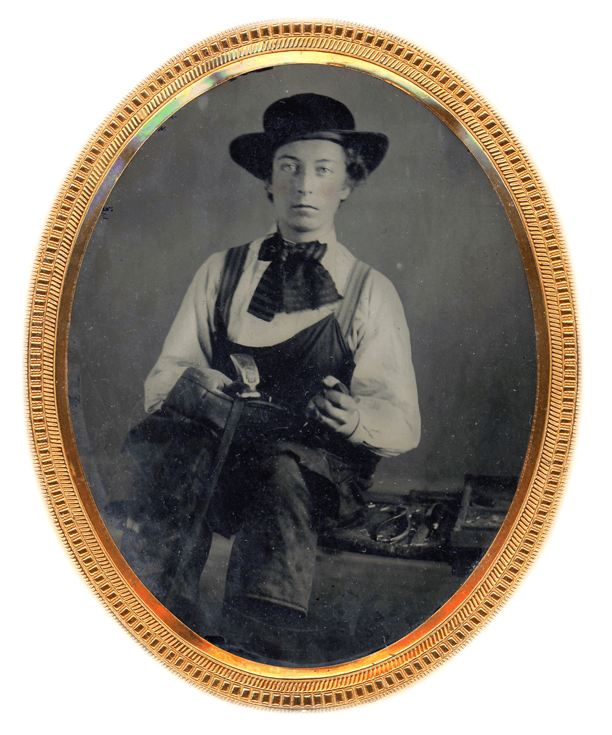 This image, likely taken in the 1850s, shows a young shoemaker sitting at his workbench, posed in the act of driving a peg into the sole of a shoe he is making. Pegs were used instead of cord to attach soles on shoes up until the mid-19th century.