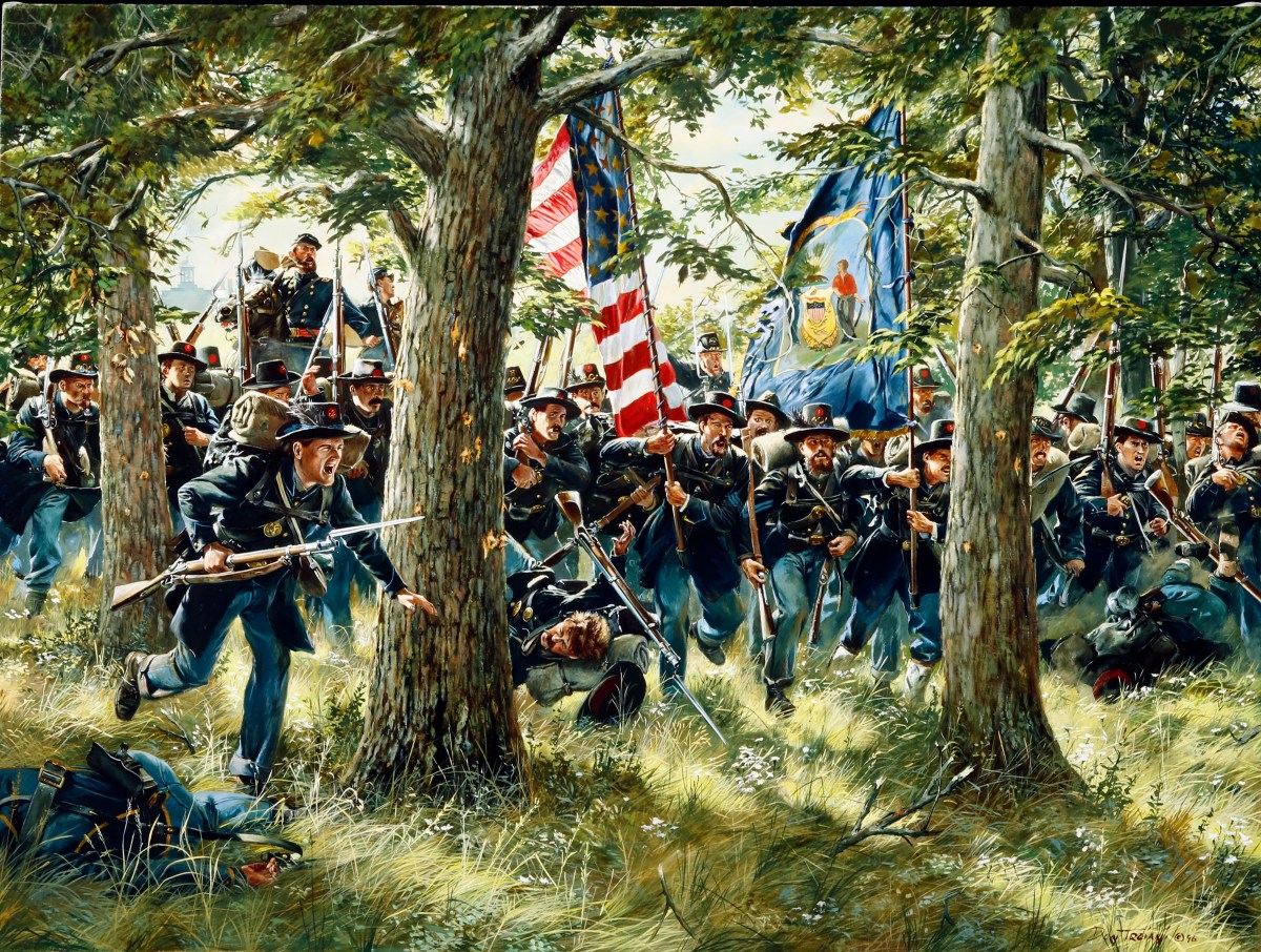 The 2nd entered the Battle of Gettysburg on July 1 with 28 officers and 274 enlisted men. As the regiment’s men entered the Herbst Woods, they encountered 1st Corps commander Maj. Gen. John Reynolds, who told them to “drive these fellows out of the woods.” As the Badger State soldiers entered the woods, an initial volley from the Rebels delivered at close range knocked an estimated 100 men out of the ranks. Some sources claim that the same volley killed Reynolds. As the other Iron Brigade regiments rushed into Herbst Woods to support the 2nd, the opposing Confederates of Brig. Gen. James J. Archer’s Brigade broke to the rear. Major John Mansfield, now commanding the 2nd, ordered the regiment to pursue the Confederates at the double-quick. After crossing Willoughby’s Run and capturing General Archer and dozens of other prisoners, the Iron Brigade withdrew to the Herbst Woods.