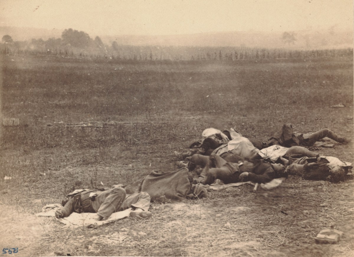 Or he could have labeled the men as casualties from the well-known Irish Brigade as a marketing ploy. Gardner wanted to make money on his images, and wasn’t beyond manipulating the facts to make a buck, as he would prove in 1863 when he dragged a Confederate “sharpshooter” to his Devil’s Den lair at Gettysburg.