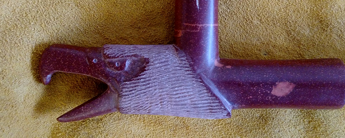 Once Travis frees the stone, the true art begins. He specializes in eagle-head effigy pipes but remains open when inspiration strikes. “Lots of times when I look at a pipestone block, it tells me what it wants to be,” he says. “Once I have my piece of stone picked out, I’ll lay my pipe pattern on it, draw it in pencil, then use my hacksaw to cut the pipe out of the rock. I’ll use the rasp file—it’s aggressive on one side and smoothing on the other. The rough side knocks down the pipestone quickly to the basic shape I want. I use the finer side to shape it the way I want it. I use sandpaper to finish the pipe. I drill my holes with a steel drill bit. We use beeswax to darken the stone.”