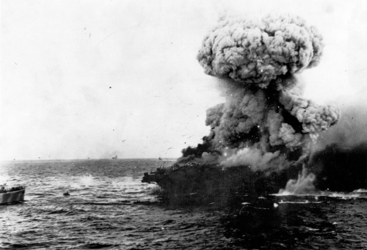 As the fires approached the torpedo warhead magazine, Admiral Fitch spoke kindly to Sherman, “Well, Ted, I think it’s time to get the men off.” Sherman gave the order to abandon ship, which was done with commendable discipline. More than 92 percent of the ship’s crew survived the day. Sherman was the last to leave the ship. The destroyer Phelps then finished her with five torpedoes at 7:52 p.m., and Lexington went down. Said Lieutenant Commander Stroop, who had stuffed the day’s flag dispatches into his pocket before clambering down a rope into the water, “We felt very badly about the whole business.”