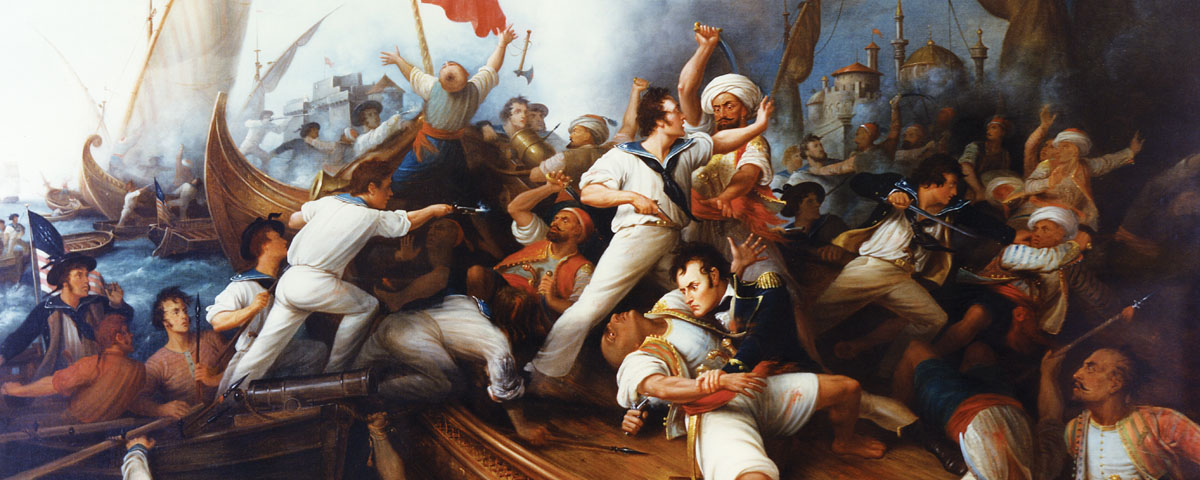 Though Decatur’s raid did not bring the First Barbary War to an end, it was the conflict’s signature event and defined it for the American people. The war itself went on for another year and a half. Reinforcements arrived from the United States in the spring of 1804, and Preble devised a new plan, to enter Tripoli harbor with small gunboats and backed up by Constitution and a number of brigs. On August 3 he set his plan in motion. The action was fierce as American boarding parties swarmed the decks of the Tripolitan ships. Decatur later remarked that “hand to hand is not child’s play—’tis kill or be killed.” His brother, James, died in this action, felled by a gunshot wound to the head. Decatur pursued the enemy boat that had delivered the fatal shot, boarded it and, in a bloody fight, his 10 Americans killed all but three of the vessel’s 24 occupants. Preble, meanwhile, brought the larger ships into action, and Constitution moved in close to pour cannon fire into the bashaw’s castle. One volley brought down a minaret.