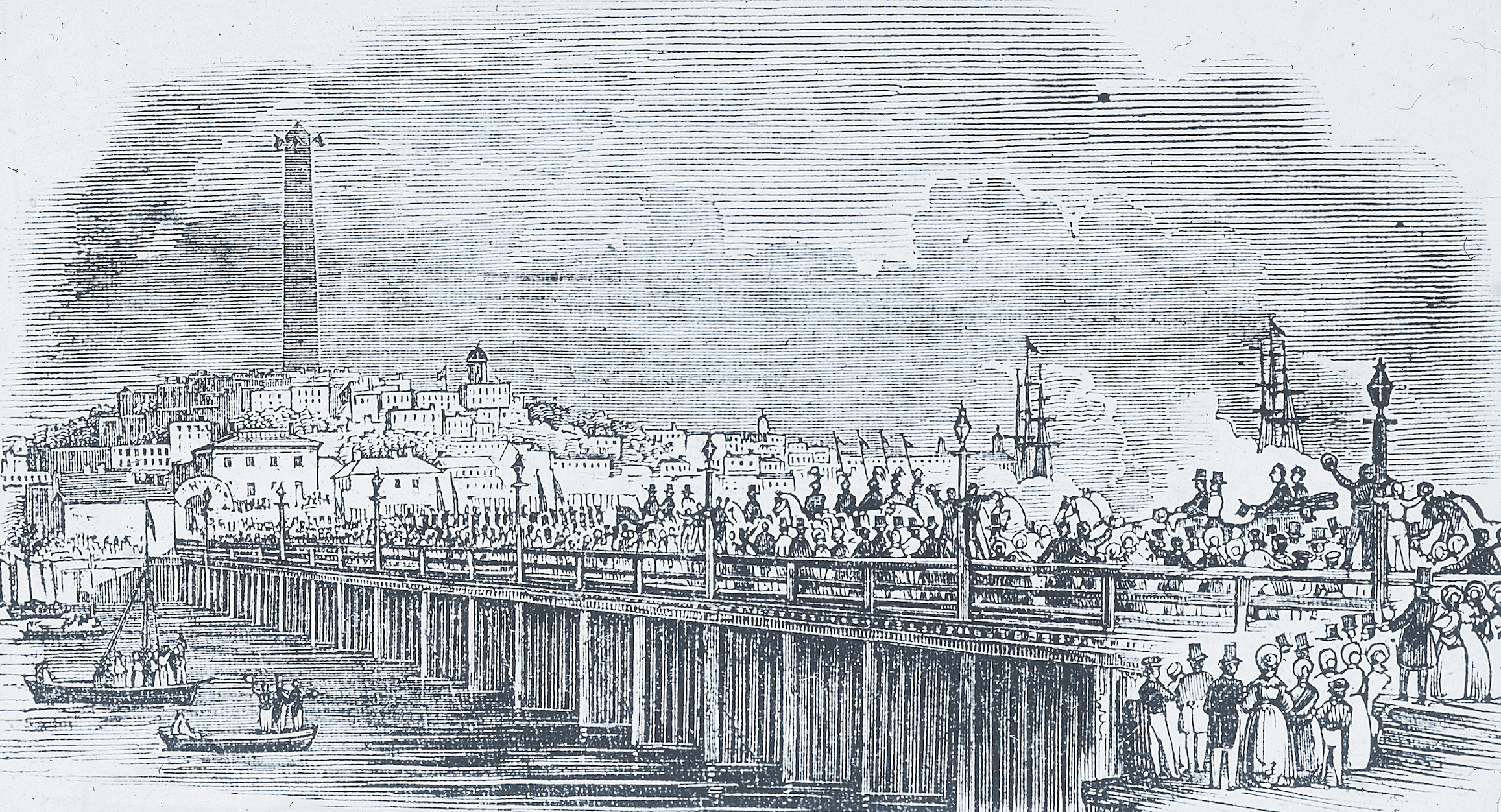Every June 17, Bostonians packed the Warren Bridge, here in 1843, to get to Bunker Hill to fete that 1775 victory over British forces. (Library of Congress)