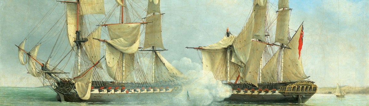 Midshipman John Tancock later recalled the men had orders to fire at Réunion’s rudder, while the French gunners were aiming high in an effort to dismast Crescent. Their respective fire took effect, soon cutting up the rigging and sails of both vessels. Despite losing his ship’s fore-topsail yard and fore-topmast, Saumarez was able to maneuver Crescent under Réunion’s stern on the starboard quarter, allowing the British gunners to rake the enemy vessel fore and aft with murderous effect. Seeing no colors flying on Réunion, Saumarez ordered his men to cease fire. But the colors had been shot away, not struck, and the French gunners soon opened a ragged broadside. Crescent’s gunners responded and “kept up so good a fire,” Saumarez later wrote, “that in a short time [the French] waved their colors and made signs from the gunwale with their hats that they had struck.”