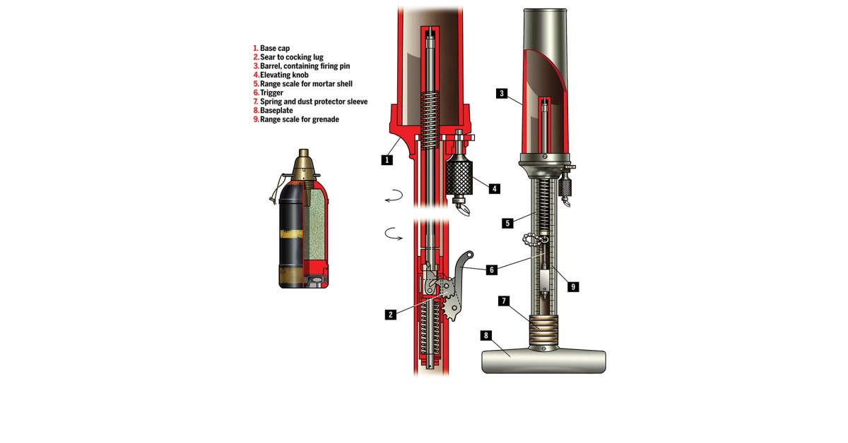The mortar’s curved baseplate allowed its crew to set it on the ground, atop a log or against the base of a tree at a 45-degree angle. Its spring-loaded and lanyard-operated firing pin mechanism also made it possible to brace the mortar against a wall or tree trunk and fire horizontally. Japanese manuals noted the weapon was carried strapped to the leg above the knee—not fired from it. Believing the latter to be true, the Allies dubbed the Type 89 the “knee mortar,” a misnomer that came back to haunt (i.e., seriously injure) anyone thus trying out captured specimens.