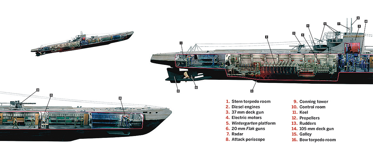 Although the ubiquitous German Type VII Unterseeboot was a successful submarine fully capable of crossing the ocean during the 1939–45 Battle of the Atlantic, its crew had to operate under extremely cramped conditions (as graphically depicted in writer-director Wolfgang Petersen’s 1981 war film Das Boot), and the Kriegsmarine desired a vessel capable of ranging even farther afield, into the South Atlantic or even the Indian Ocean. The result was the Type IX. First entering service in 1937, the Type IXA soon gave way to the longer range Type IXB, though Germany commissioned just 22 of both types. Types IXC and IXC/40, with significantly increased fuel capacity for even greater range, brought the series to its zenith, with 141 entering service. Rounding out the type were variants on the Type IXD, which was nearly 36 feet longer than the IXC and built to either be faster (20 knots on the surface in the IXD1) or much farther ranging (up to 31,500 nautical miles in stripped-down transport versions).
