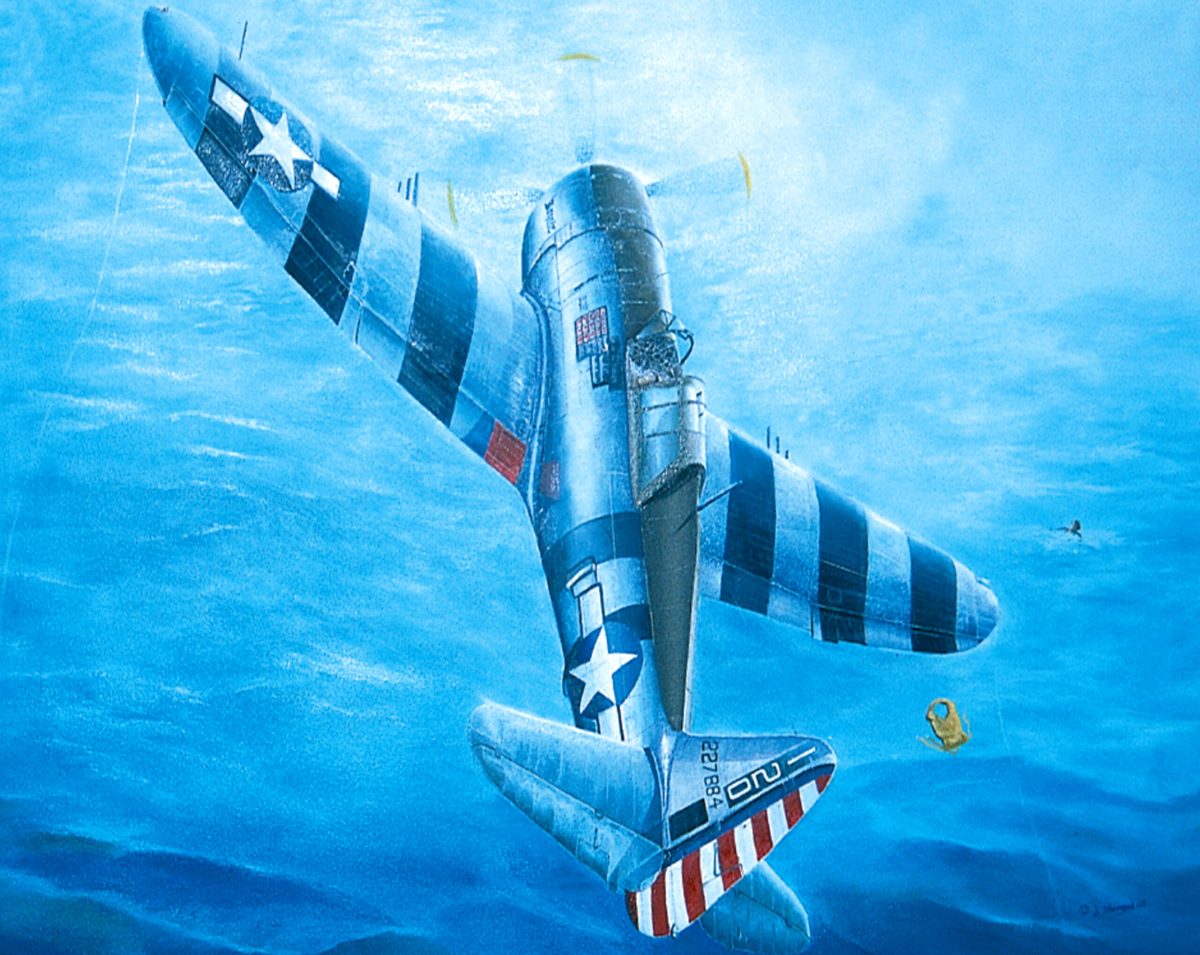 David Hammond depicts Republic P-47D pilot Major Bill Dunham circling over a Japanese flier he had just shot down over the Philippine Sea in December 1944. Dunham is shown tossing his own lifejacket to the Nakajima Ki.43 “Oscar” pilot in the waves.