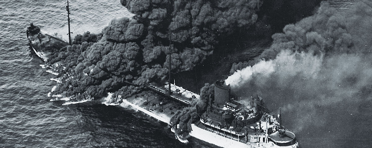 Nine hours later, the carrier Wasp and four destroyers were proceeding north from Hampton Roads to rendezvous with Task Force 15 when, at 35 minutes past noon, lookouts on the destroyer Mayrant sighted a shipwreck bearing nearly due north. Breaking off formation with the carrier, Mayrant and Rowan maneuvered into a large oil slick, where they helped to rescue 10 survivors from the Coimbra’s 46-man crew. The officer of the deck on Mayrant, Lieutenant j.g. Franklin D. Roosevelt Jr., dutifully recorded the two-hour rescue in the ship’s deck log as the two destroyers retrieved the sodden tanker crewmen.