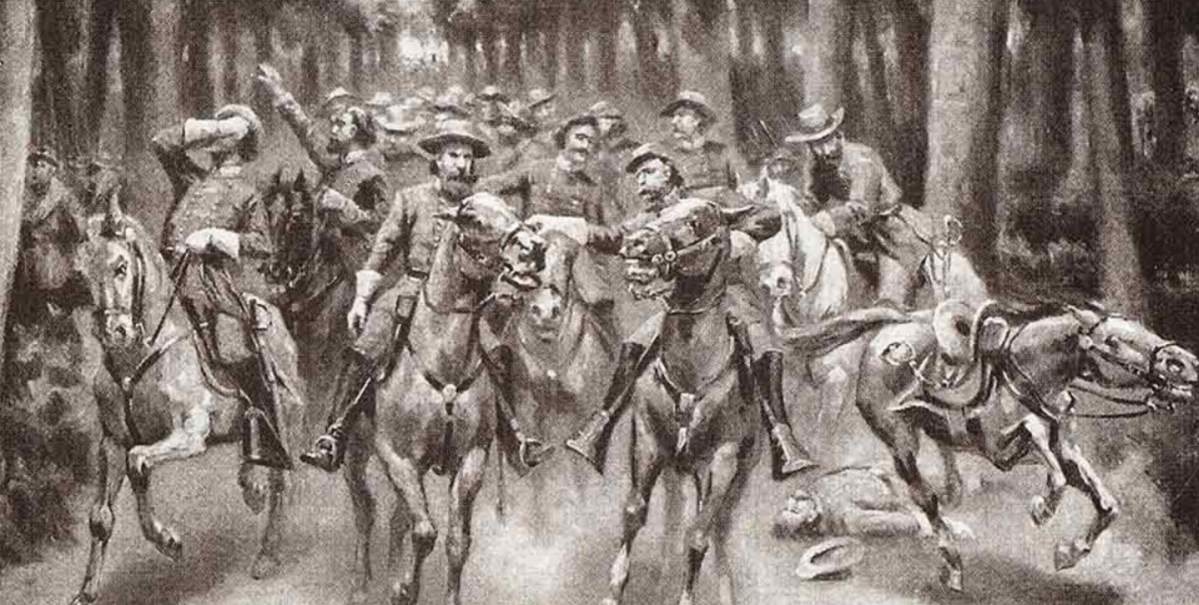 Dawson recalled a jubilant Jenkins, “his face flushed with joy” at the Confederate success thus far. At Jenkins’ urging, the men “cheered lustily” for Longstreet. And then disaster struck. “In the shaded light of the dense tangle, a shot or two went off, then more, and finally a strong fusillade,” said Sorrel, who was riding next to Longstreet.