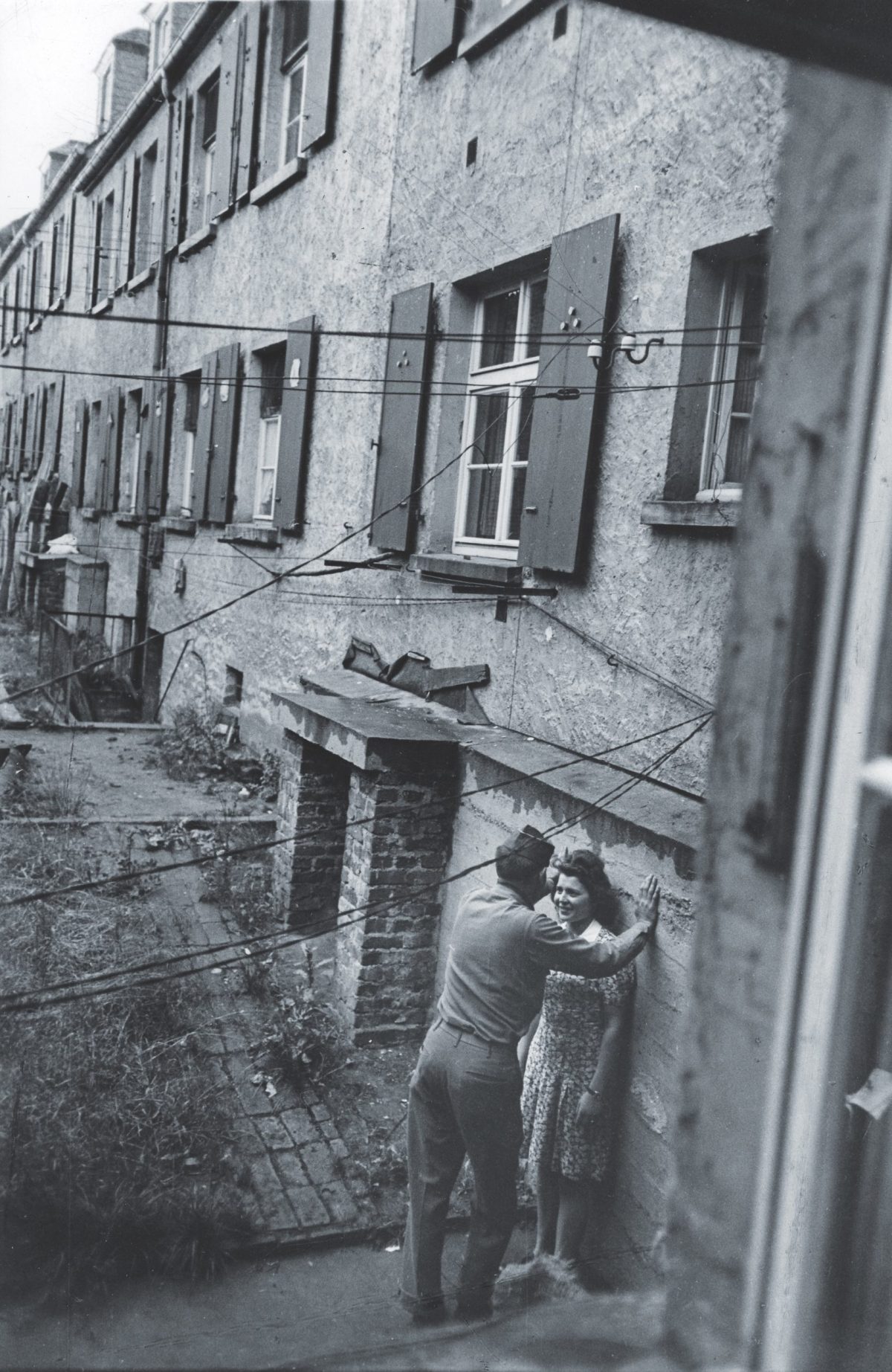 Four months later, the magazine devoted several pages to a photo story illuminating the “No. 1 gripe of American GIs in Germany, the official policy of ‘nonfraternization’”: a rule that meant “soldiers are forbidden marriage, visits, drinking, shaking hands, playing games, hobnobbing, exchanging gifts, walking, sitting, dancing or talking to the Germans.” To show how egregiously American soldiers were violating the ban, Life devoted an entire page to a photograph showing a GI pinioning a young woman against the wall of a dreary apartment building, his body angled toward hers, their faces just inches apart. “In a back yard near Wiesbaden, U.S. soldier corners a pretty, laughing German girl,” the caption read.