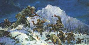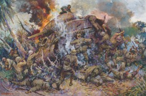 His daughter Jane Waterhouse, a successful author of novels and mysteries, showed equal devotion in publishing all those paintings and a personal tribute to the man who created them in a stirring volume entitled Valor in Action. Here is a showcase of images from the book. MH