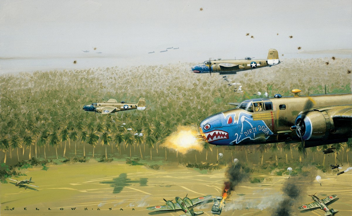 As he skimmed over the trees and lined up the sights of his North American B-25C Mitchell’s eight .50-caliber nose guns on the Japanese airstrip at Wewak, New Guinea, Lieutenant Vic Tatelman was astounded to see rows of Mitsubishi G4M ‘Betty’ bombers, Yokosuka D4Y ‘Judy’ dive bombers and Mitsubishi A6M ‘Zekes’ lined up wingtip to wingtip all along the tarmac. What a rare opportunity! All he would have to do was line up on the targets and squeeze off burst after burst. No time to check results or worry about AAA — just keep shooting! Co-pilot Lieutenant Willie Graham deployed parafrag bombs at intervals as the bomber, dubbed Dirty Dora, passed over the sitting ducks, completing a sort of double whammy that left chaos behind them on the ground.