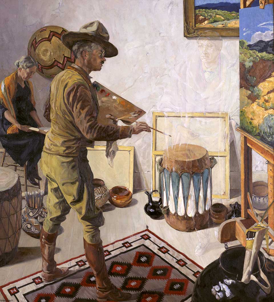 In 1922 Walter Ufer rendered a painting that depicts the Taos, N.M., artist at work in a studio, surrounded by Indian artifacts, studying an unfinished landscape with brush and palette in hand. His long-suffering wife Mary sits reading a book in a corner, while the faint ghost of an Indian leans against his easel. Titled Fantasies, it shows Ufer at work amid the subjects he held dear.