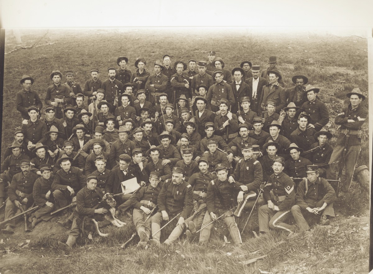 Carl Sandburg was born in Galesburg, Illinois, in 1878. His Swedish immigrant parents were poor, and Sandburg left school at an early age to help support the family, working as a barbershop porter, a dishwasher, and a brickyard hand, among other odd jobs. At 17 he traveled west to Kansas as a hobo, but when the Spanish-American War broke out in 1898, he enlisted in the 6th Illinois Infantry. (He’s in the center of the photograph at right.) Sandburg landed at Guánica with his unit during the invasion of Puerto Rico later that year but never saw battle.