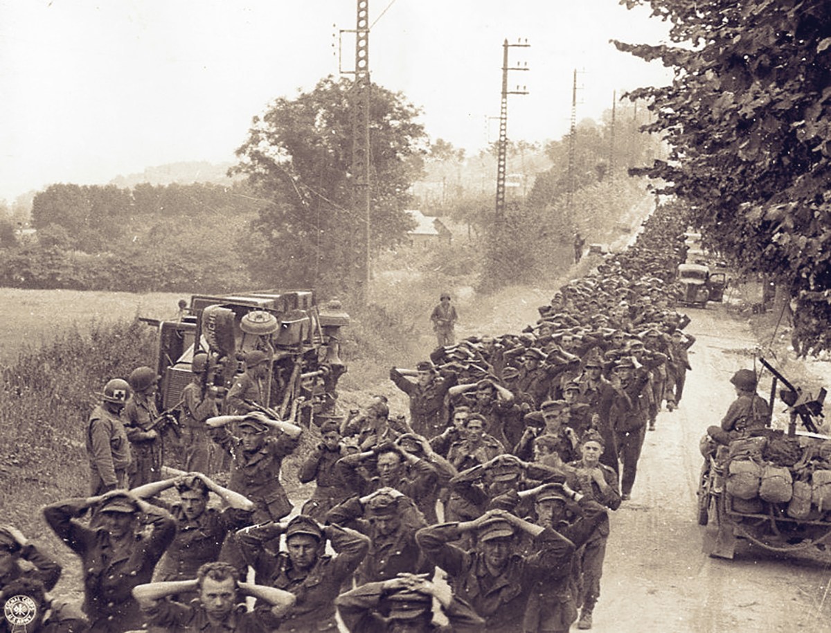 Following a preliminary air bombardment, Bradley unleashed his ground forces on July 25 and, with the Germans stretched thin across Normandy, the Americans soon “ripped the whole Western Front open.” During Cobra, the First Army captured more than 20,000 prisoners. Most likely the German soldiers pictured here were among them.