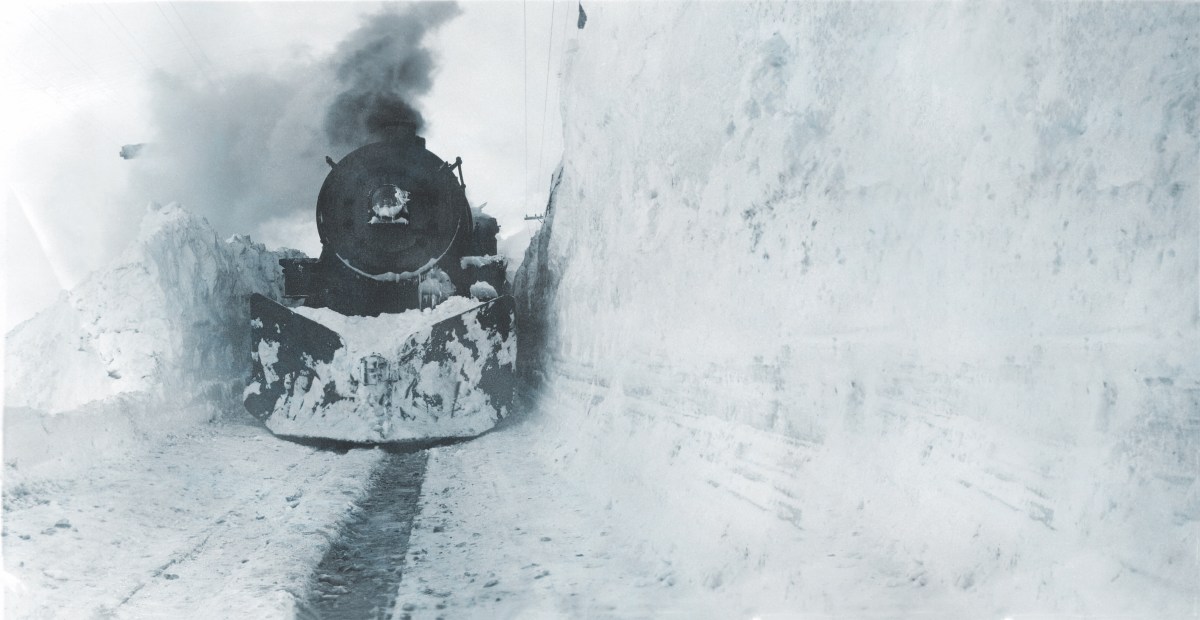 Daunting conditions haven’t yet thwarted this train, whose unseen rotary is clearing the line. In the winter of 1942-43, a series of blizzards halted operations for days. (Courtesy of Jerry Latham)