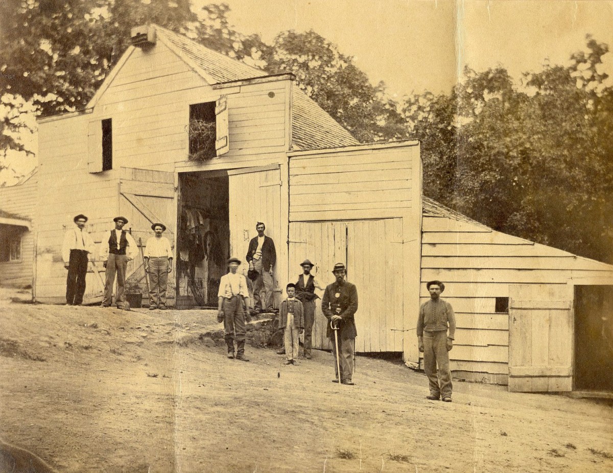 At least 56 separate facilities in Washington, D.C., were used as hospitals at some time over the course of the Civil War. One of those hospitals was Finley Hospital, which operated from 1862 to 1865. This photograph of the stables at Finley Hospital includes a non-commissioned officer. It was taken, most likely as part of a series, by Washington, D.C. photographers William Morris Smith and Samuel Mills. During the latter part of the war, Mills enlisted in the Union Army as a hospital steward. Known as Camp Sprague during its first month, Finley general hospital was located in wooden barracks. It was originally the regimental camp of the First Rhode Island Cavalry. When Walt Whitman arrived in the city in December 1862 to help with the war wounded, he was amazed and overcome by the massive hospital system. “That little town, as you might suppose it, off there on the brow of a hill, is indeed a town, but of wounds, sickness, and death. It is Finley Hospital, northeast of the city, on Kendall Green, as it used to be call’d. That other is Campbell Hospital. Both are large establishments. I have known these two alone to have from two thousand to twenty-five hundred inmates.”