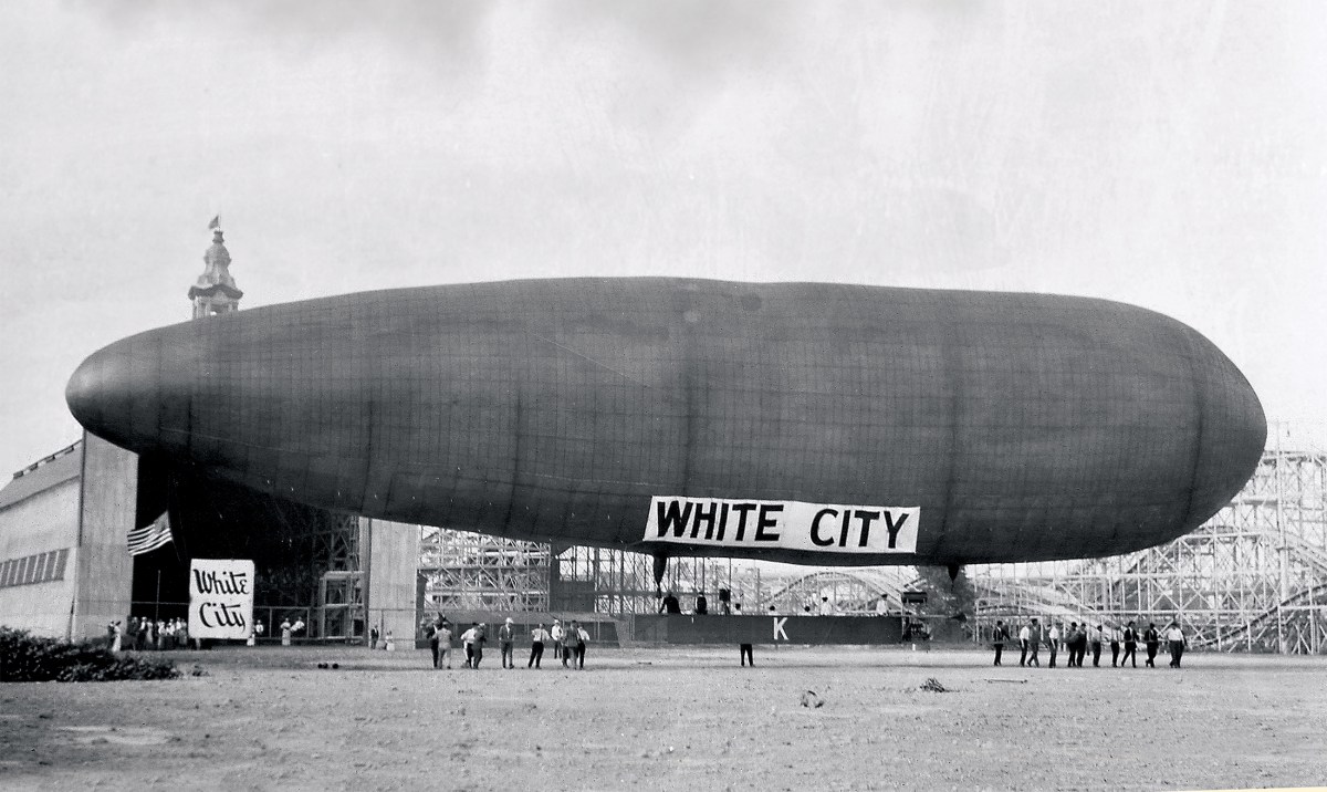 After Pasadena was packed up and shipped to Chicago on May 1, it was ready to fly again by the middle of June. The airship’s rear biplane elevators were replaced with triplane elevators, and the passenger gondola refitted. The airship was renamed White City after the amusement park in which it was now based. The ticket price was still $25. Knabenshue carefully documented each flight—passengers signed a form that read, “I, the undersigned, hereby express my willingness to undertake all risks in connection with the Airship Flight which I am about to take and fully release The White City Construction Company and A.R. Knabenshue from all liability.” Always cautious, Knabenshue canceled flights when he judged the wind too strong.