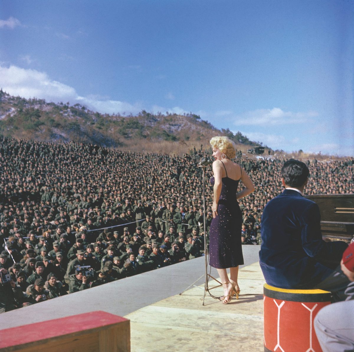 On another ice-cold day, Monroe performed at the Bulldozer Bowl—the USO’s stage in the Cheorwon Valley—for the U.S. Army’s 2nd Infantry Division. Soldiers claimed dibs on choice front-row seats seven hours before her performance. Wounded men from sick bay huddled in blue blankets while Monroe braved the chilly temperatures in her revealing summer dress, melting the hearts of the battle-hardened soldiers, many of whom had hiked several miles over frozen mountainous terrain to see her. It was worth the effort. “Marilyn came out dressed in a heavy parka,” recalled Don Loraine, who was in the audience. “She started to sing, suddenly stopped, and said, ‘That’s not what you came to see,’ and took off the parka. She was dressed in a low-cut purple cocktail dress. She was so beautiful, we all went wild, and, I might add, it was colder than hell that day. She brought a lot of joy to a group of combat-weary marines, and I for one will never forget her.”