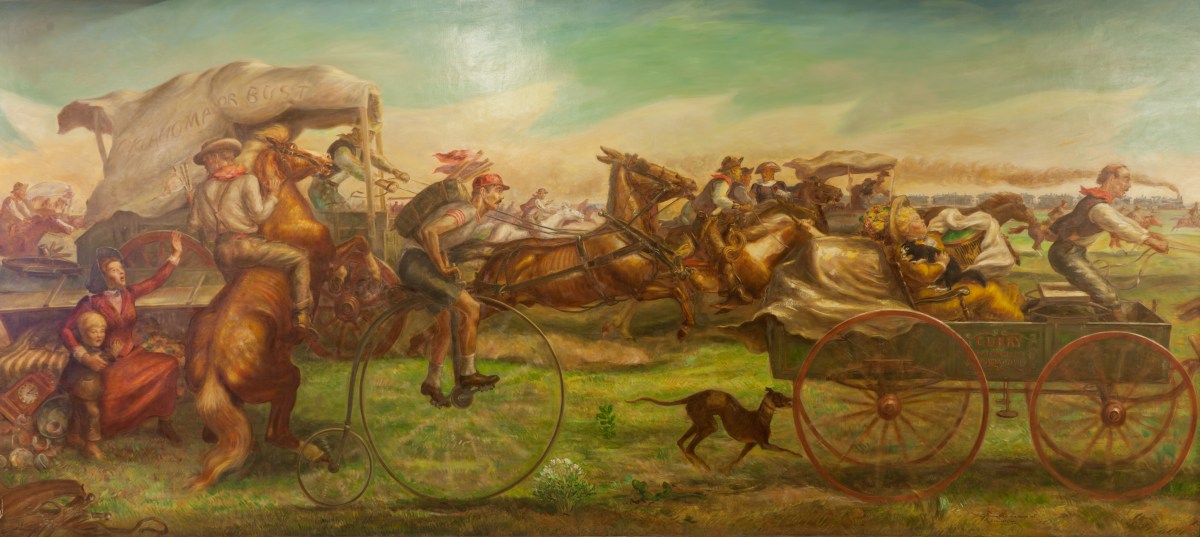 In a colossal cloud of red dust, the torrent of shouting riders and frightened horses, clattering buggies and bouncing, ponderous wagons, flowed over the boundary, fanning out across the new country…The rumbling of wagons and carts, and the yelling of the crowd, sounded to one rusher ‘like ten thousand head of cattle on a stampede.’