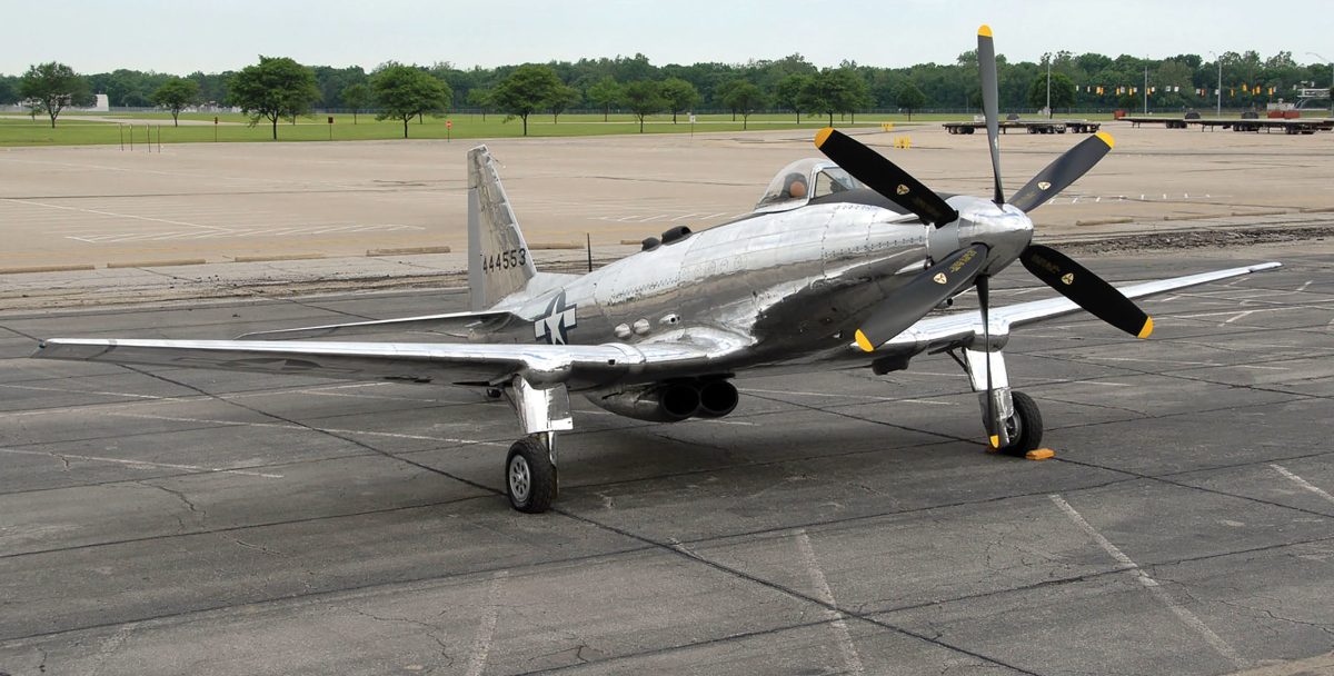 The 2,600-hp V-3420-B was two V-1710 engines—the familiar P-38/P-39/P-40 power plant—on a common crankcase. But it had two crankshafts, and cranks are the heaviest part of a piston engine. The crankshafts counterrotated, spinning two 15-foot-long driveshafts, which transitioned into a single propshaft through a large, heavy gearbox in the airplane’s nose. In the P-75A, the engine sat behind the cockpit, like a P-39’s Allison V-12, and the driveshafts ran under the pilot. Further complication was created by the need for two enormously complex contrarotating propellers to absorb the V-3420’s horsepower. (Four of the P-75’s never-installed 10 .50-caliber machine guns were in the nose, firing through the props. Imagine the complexity of an interrupter mechanism choosing clear spaces between such a Cuisinart of prop blades.)