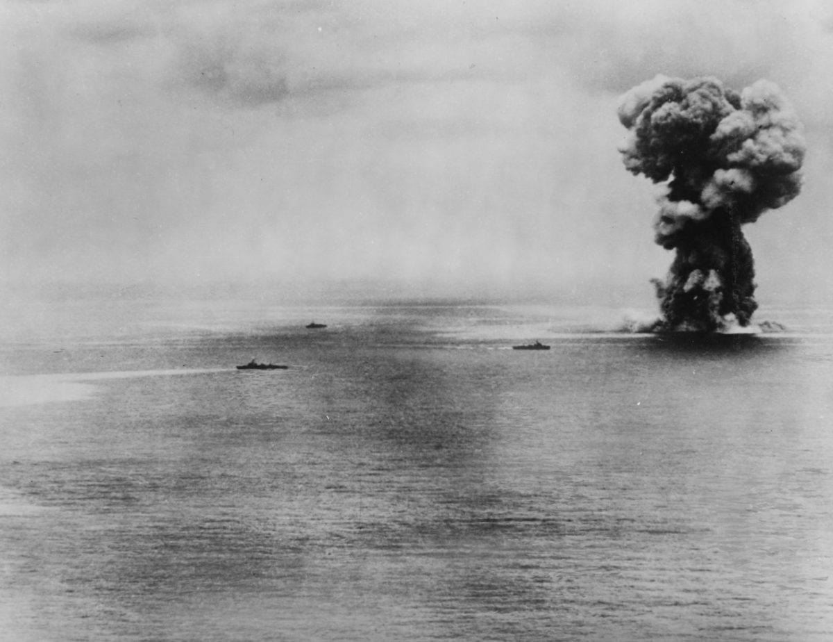 On Nov. 20, U.S. Army soldiers of the 165th Infantry Regiment landed on Makin in the Gilbert Islands and the island was secured by the 24th. That day, however, Japanese submarine I-175 slipped into the task group and fired a spread of three torpedoes at the aircraft carrier.