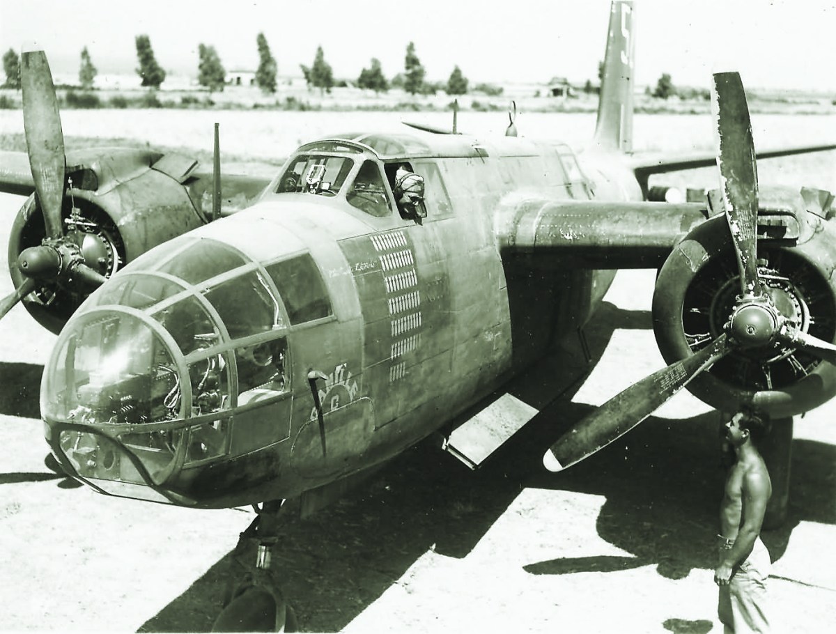The map of coastal Italy in the background marked with German flak positions indicates early 1944; around this time, the Twelfth Air Force’s 47th Bombardment Group (Light) operated A-20Bs in support of Allied ground forces at Anzio. The group operated a mix of the two A-20 variants—the standard, light-attack version and the gunship version—to strike bridges, roads, and troop concentrations at low to medium altitude. In Italy, the 47th also conducted “night intruder” missions, where the group’s aircraft sortied at night and operated independently of each other to attack individually assigned targets.