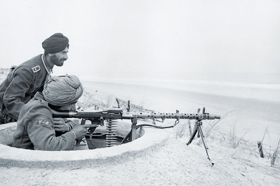 German-uniformed Sikh members of the Free India Legion train along the Normandy coast of France. (