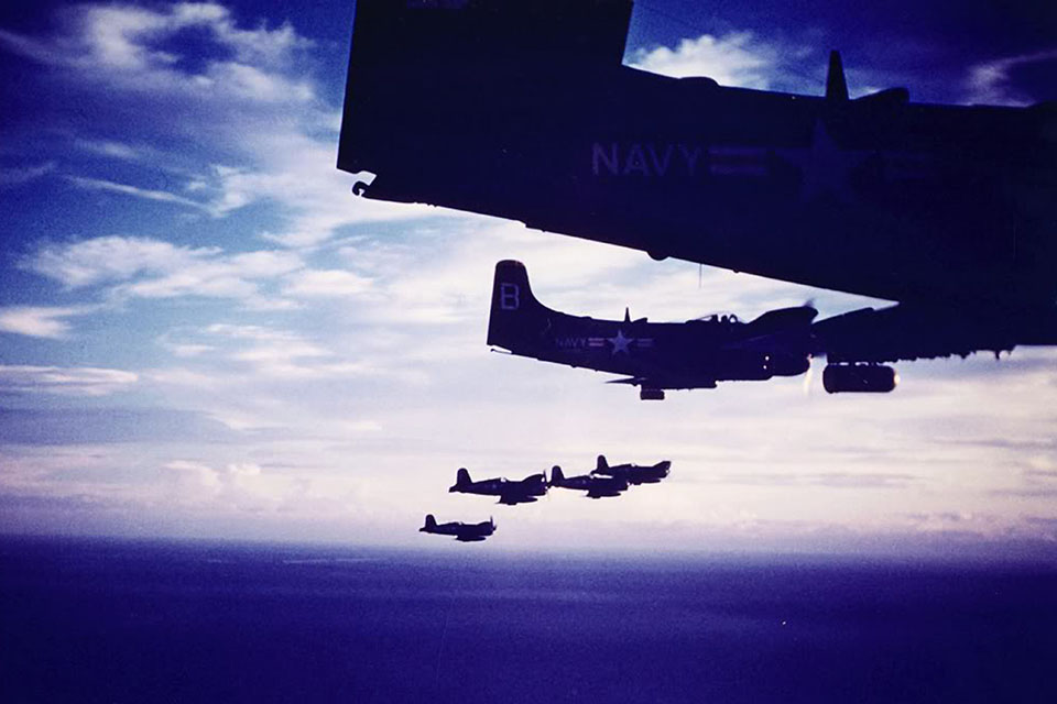 Douglas AD-4 Skyraiders (foreground) of U.S. Navy squadron VF-194 return from a bombing mission, accompanied by Vought F4U-4 Corsairs of VF-44. (U.S. Navy)